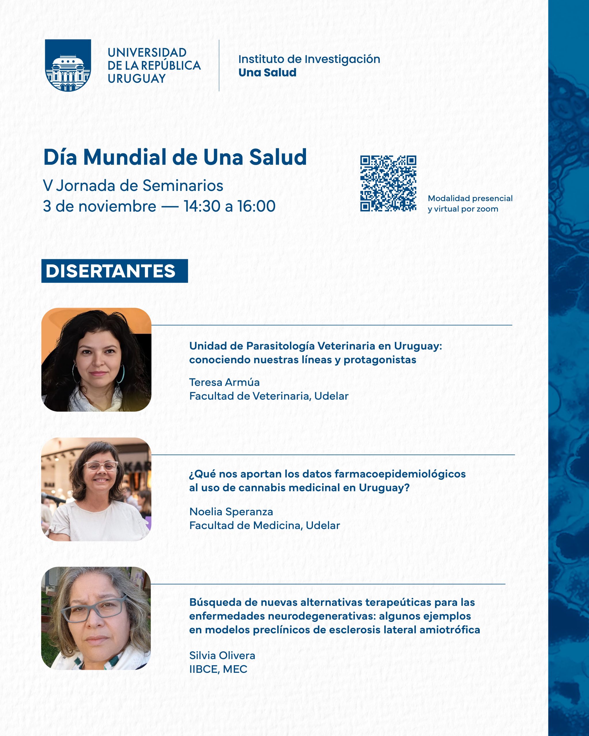 • Teresa Armúa (Unidad de Parasitología Veterinaria, Facultad de Veterinaria, Udelar) presentará “Unidad de Parasitología Veterinaria en Uruguay: conociendo nuestras líneas y protagonistas”, donde compartirá los avances de los grupos dedicados al estudio de parásitos y enfermedades zoonóticas, y su impacto en la salud animal y pública.